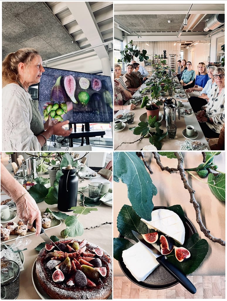 På bordet ventede små retter, der hver især viste fignens mange herligheder: Birgitte havde lavet små dekorative scones med figner og mascarponecreme og figenmarmelade, oste med figenkiks, ligesom der både var friske og tørrede figner – og en helt særlig 20 dage gammel ost, lavet på figensaft og nænsomt pakket ind i dekorative figenblade.